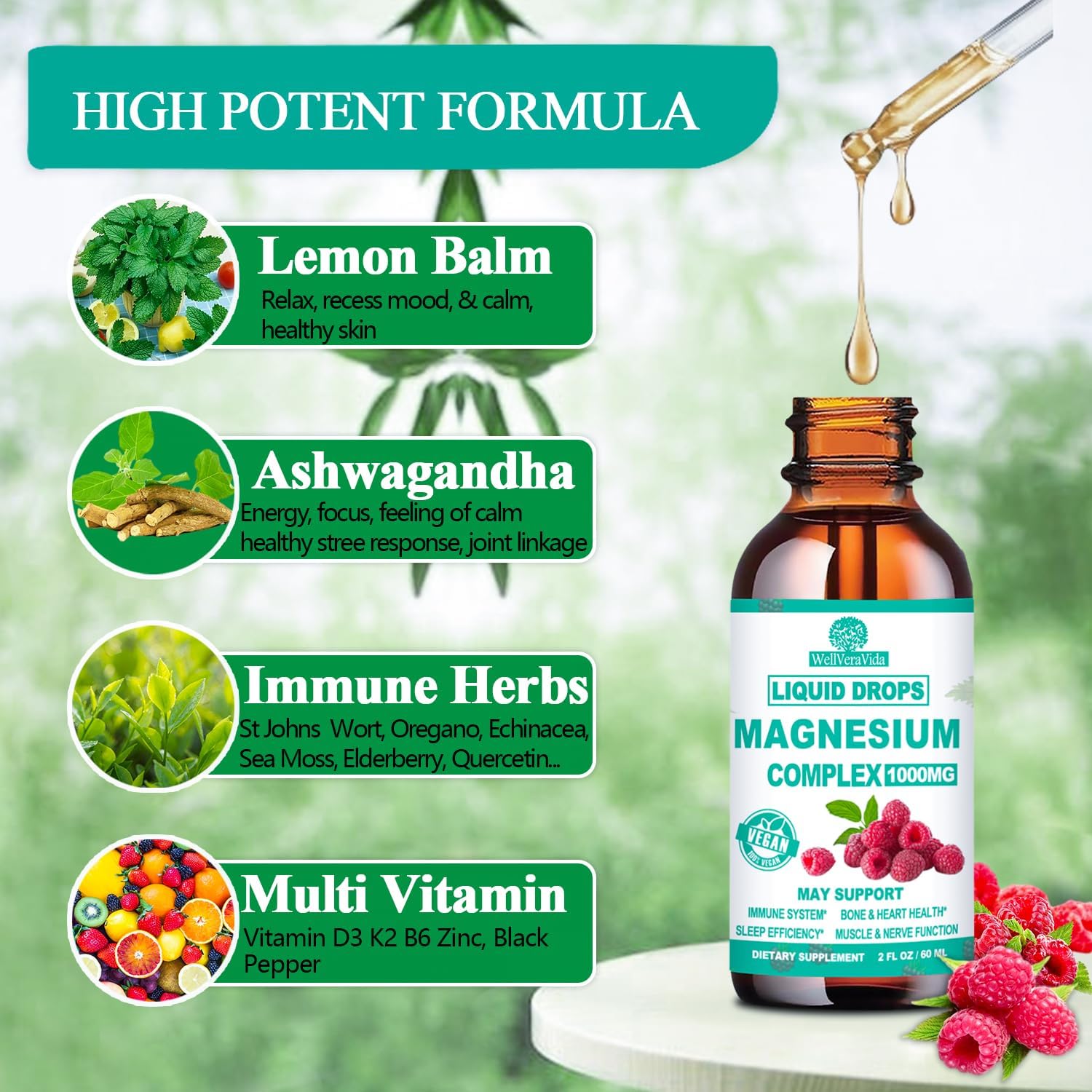 - ✅ POWERFUL BLEND OF MAGNESIUM WITH MULTIVITAMINS & HERBS: Our organic, ultra-concentrated Magnesium liquid drops offer huge improvements for your physical and mental well-being. This Magnesium 5 complex blend, enriched with Vitamin D3, K2, B6, and Zinc not only supports a robust immune system but also enhances brain functions, nerve health, and strong bones and muscles. Additionally, we've included Lemon Balm, L-Theanine, and Ashwagandha, St Johns Wort, Elderberry, Quercetin,Valeran Root, Oregano, Echinacea, chamomile all renowned for their calming effects and strengthening the immune systems. These nutrients work synergistically to enhance overall health and well-being.